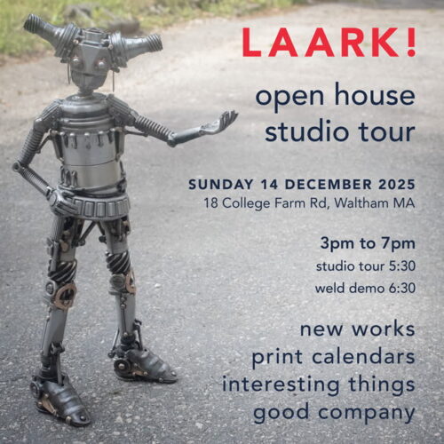 As some of you may have heard, I’m transforming the upper-half of my studio space at the Artisan’s Asylum in to a microgallery: to be called the Ready Room. Please join me in celebrating my new level of commitment towards sculpture and art in a celebration, and see my newest never-before seen works. Warning: this is a fifty foot space, so things will be crowded to say the least. I will do my best to accommodate!