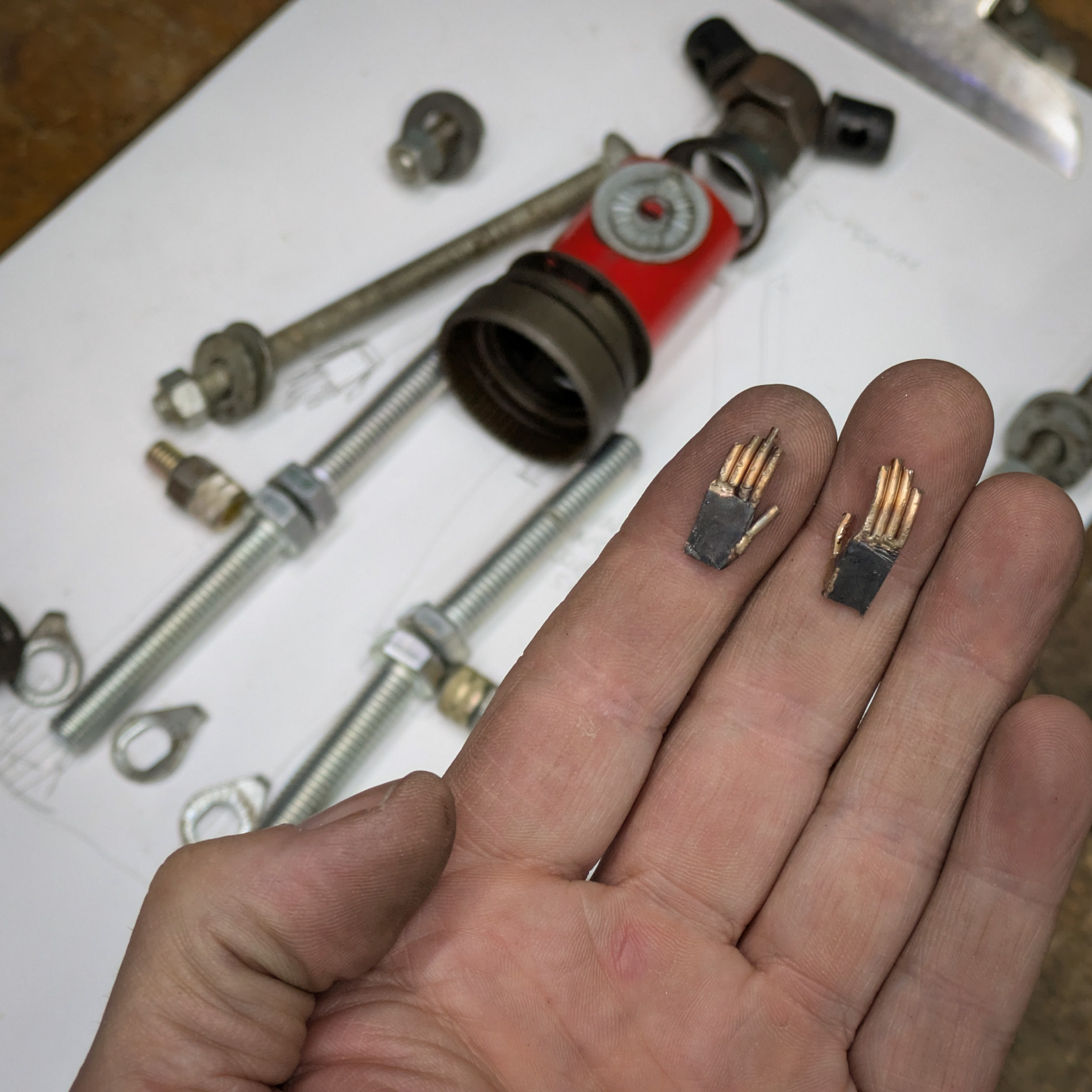 Her fingers are individual clips of ERS-80 TIG weld wire, each fused one-at-a-time to a teensy piece of plate steel. This process does not go smoothly without trail and error, and it took many attempts before coming up with a solution. As a sculptor, there’s always new horizons to pursue, even with a lifetime of experience.